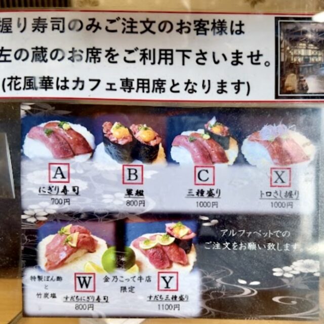 一番人気はAの3種盛りももちろん美味しいんですが、おすすめは断然Xの「牛トロさし握り」。